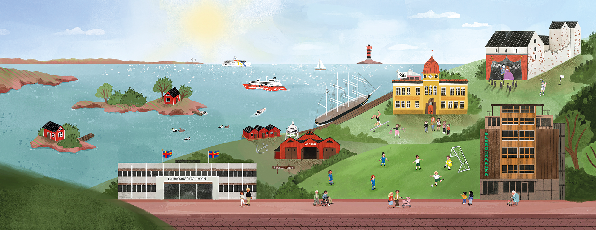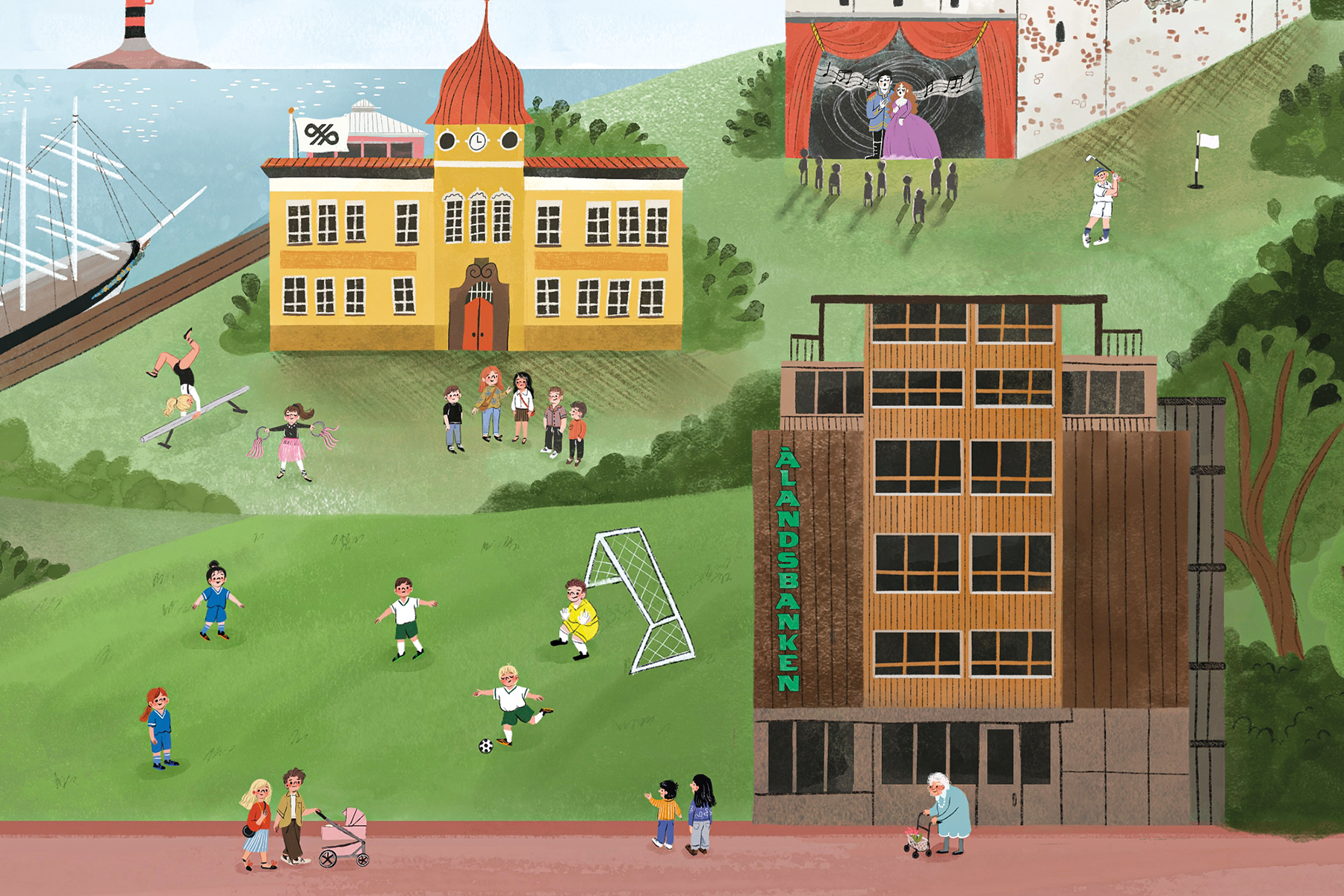 Illustration depicting different kinds of community engagement for Ålandsbanken/the Bank of Åland. Through long-term engagement in Åland, the bank contributes to sports, culture, education, and initiatives that strengthen the region’s future and overall attractiveness, and all these aspects come together in the illustration that is used as head image on the bank's website.