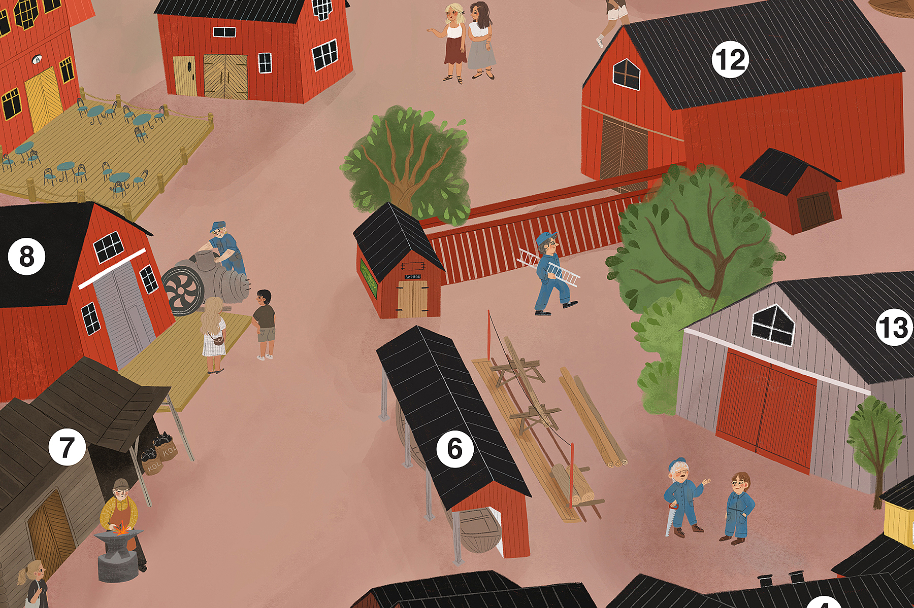 Area map over the Maritime Quarter in Mariehamn, Åland islands. The map is showing buildings and businesses in the quarter, and we can see both visitors and workers spread out through the area.
