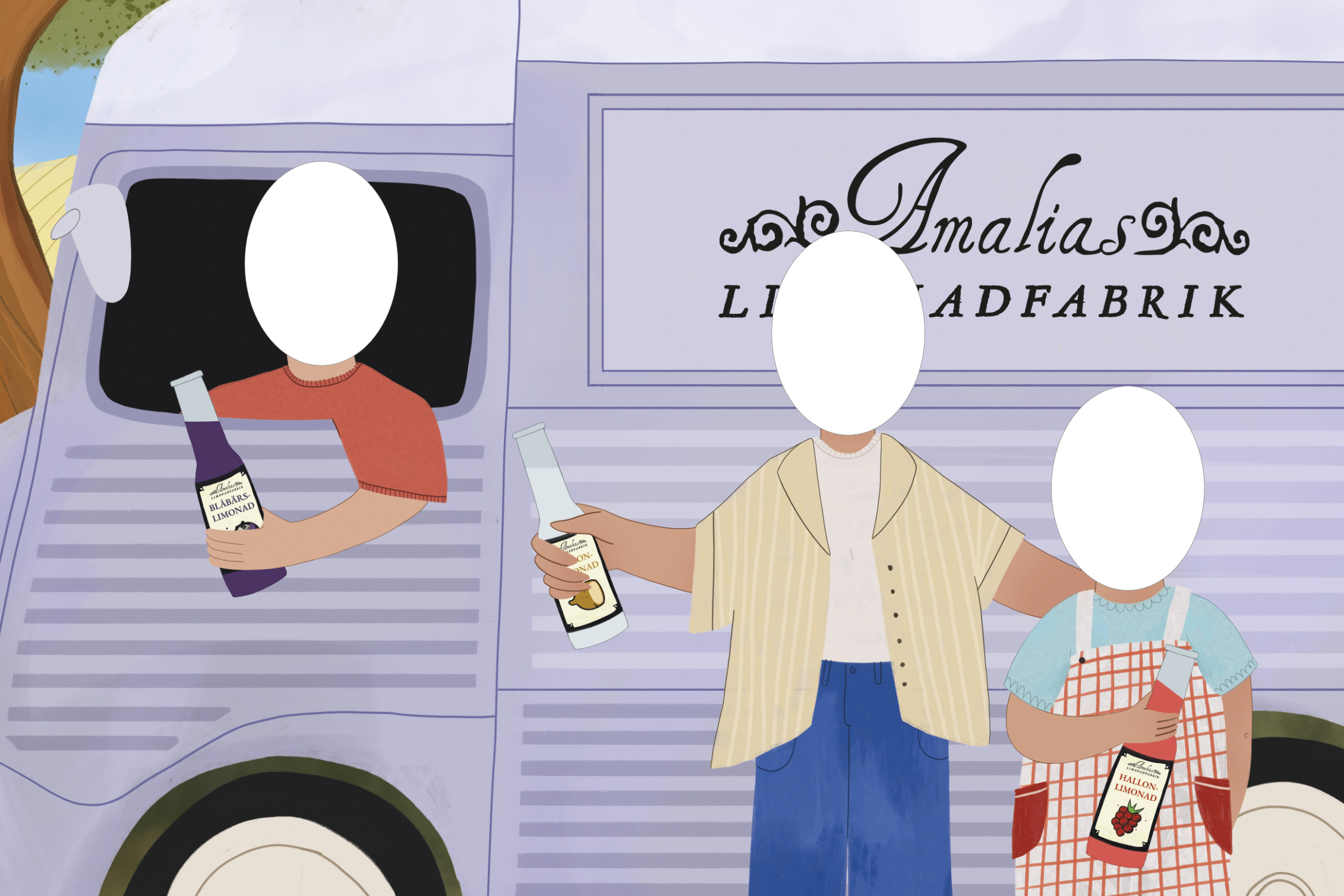 Illustrated photo op wall for Amalias Limonadfabrik's farm shop on Åland islands with cutouts for up to three people.